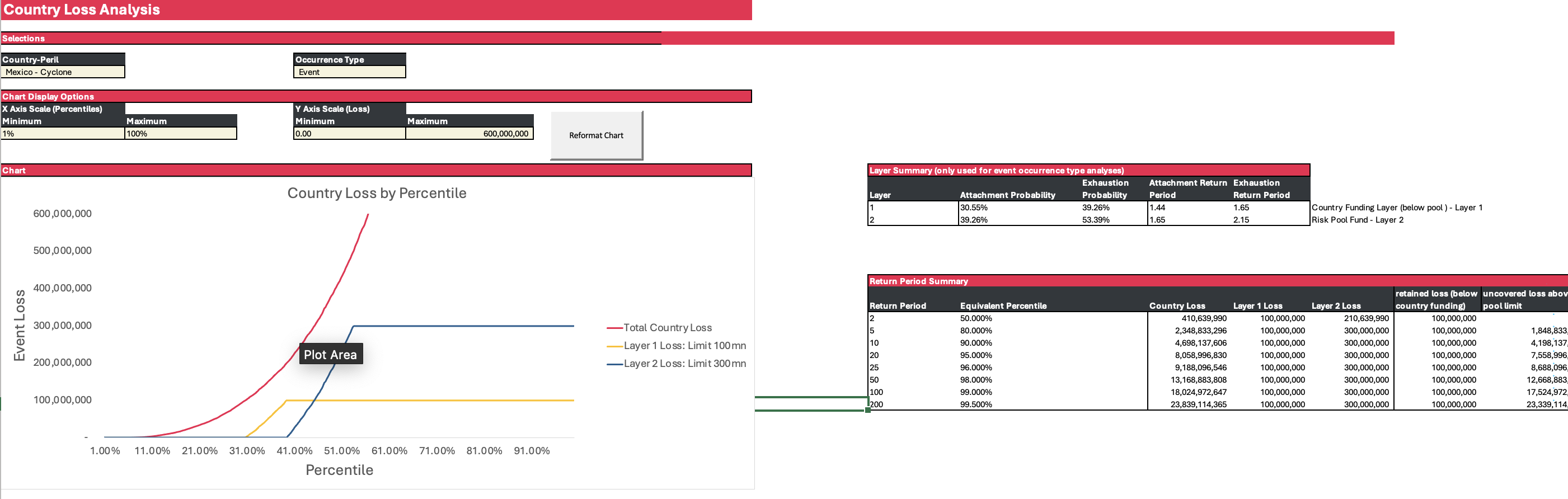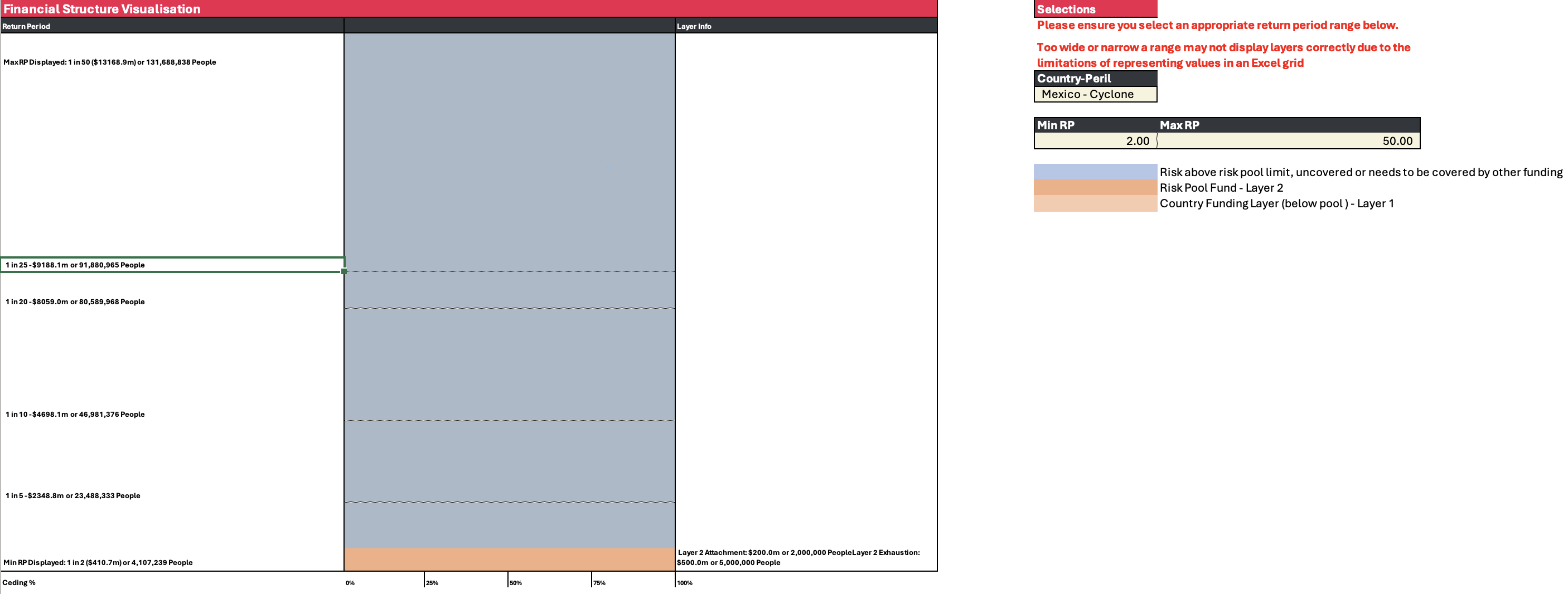 The ‘Return Period Summary’ table (cells I21 to N28) shows total country loss and loss per layer for selected key event return periods or frequencies. The term ‘loss’ is used as these are losses from the country and from the layers of funding, but you can also think about it as the total financial requirement for those size events. You can also think of the ‘layer losses’ as the payouts from the layers needed to cover your part of the risk.